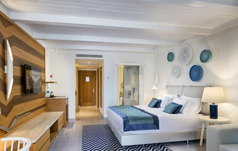 Номера и сьюты продуманы до мелочей: натуральные ткани, мягкое освещение, просторные балконы с видом на море. В каждом номере — кондиционер, мини-бар, сейф, телевизор и рабочая зона.